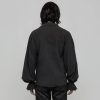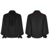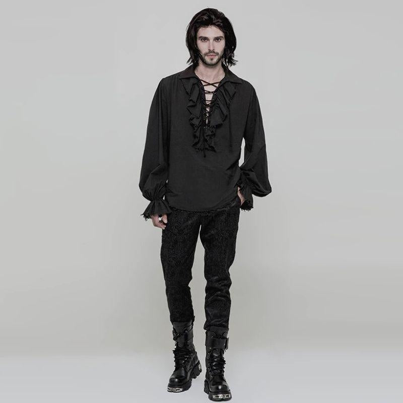 Deze katoenen blouse voor mannen is de typische top van de piraat. Het bevat alle kenmerkende elementen van het historische kledingstuk: vetersluiting aan de voorkant, jabotkraag, pofmouwen en een rechte, ruime snit. Met deze kenmerken is de blouse bijzonder comfortabel. Meer dan een getrouwe weergave van een kledingstuk uit die tijd, is het een donker en karaktervol stuk, geschikt voor een gothic of steampunk garderobe.